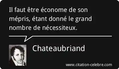 Cette citation de Chateaubriand signifie que vous devriez utiliser votre mépris avec parcimonie. Le mépris est un sentiment de dédain, de supériorité ou de profonde indifférence envers quelqu'un ou quelque chose considéré comme indigne. L'expression «étant donné le grand nombre de nécessiteux» est une métaphore qui suggère qu'il y a tant de personnes qui pourraient «mériter» ce sentiment (les «nécessiteux» de mépris), que si vous le distribuiez sans compter, vous en manqueriez rapidement.