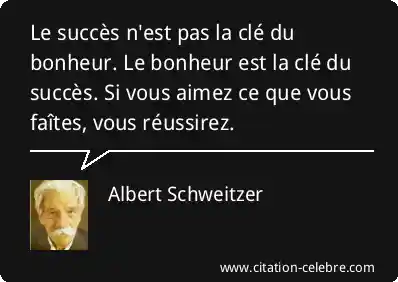 Cette célèbre formule d'Albert Schweitzer inverse la perception commune du lien entre succès et bonheur. Elle affirme que le bonheur est la cause, et le succès l'effet. En d'autres termes, pour réussir, il ne faut pas d'abord chercher le succès pour être heureux, mais cultiver le bonheur et la passion dans ce que l'on entreprend. La réussite découle naturellement de l'amour que l'on porte à son activité.