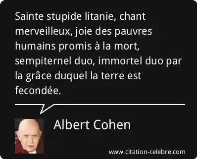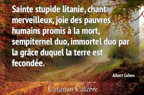 Sainte stupide litanie, chant merveilleux, joie des pauvres humains promis à la mort, sempiternel duo, immortel duo par la grâce duquel la terre est fecondée.