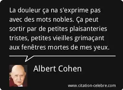 La douleur ça na s'exprime pas avec des mots nobles. Ça peut sortir par de petites plaisanteries tristes, petites vieilles grimaçant aux fenêtres mortes de mes yeux.