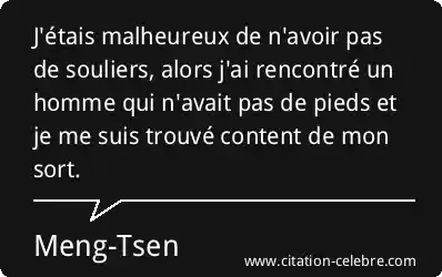 J'étais malheureux de n'avoir pas de souliers, alors j'ai rencontré un homme qui n'avait pas de pieds et je me suis trouvé content de mon sort.