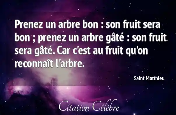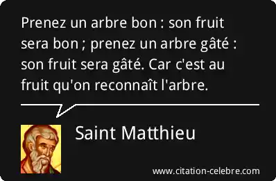 Prenez un arbre bon : son fruit sera bon ; prenez un arbre gâté : son fruit sera gâté. Car c'est au fruit qu'on reconnaît l'arbre.