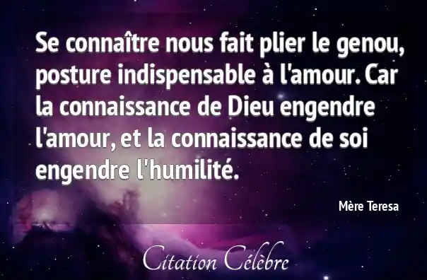 Se connaître nous fait plier le genou, posture indispensable à l'amour. Car la connaissance de Dieu engendre l'amour, et la connaissance de soi engendre l'humilité.