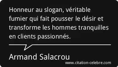 Honneur au slogan, véritable fumier qui fait pousser le désir et transforme les hommes tranquilles en clients passionnés.
