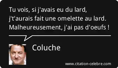 - Vocabulaire : Le vocabulaire est simple, populaire et très imagé (omelette, lard, œufs). Il utilise un registre familier ("Tu vois", "j't'aurais fait", "j'ai pas d'oeufs"), typique de l'approche de Coluche qui s'adressait directement et sans filtre à un public populaire.