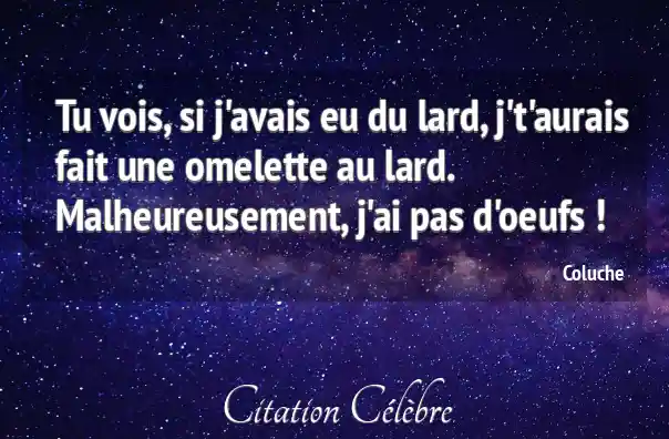 - Style : Le style est celui de l'antithèse absurde. L'annonce d'une possibilité ("si j'avais eu du lard...") est immédiatement rendue caduque par une impossibilité majeure ("Malheureusement, j'ai pas d'oeufs !"). Cette structure crée un effet de surprise comique qui est la marque de l'humour coluchien.