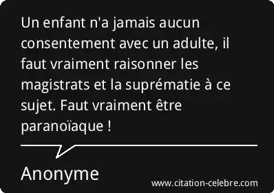 Un enfant n'a jamais aucun consentement avec un adulte, il faut vraiment raisonner les magistrats et la suprématie à ce sujet. Faut vraiment être paranoïaque !