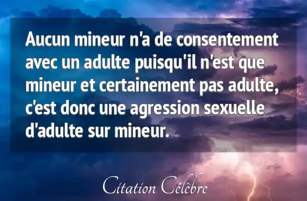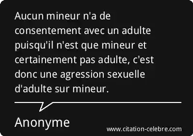 Aucun mineur n'a de consentement avec un adulte puisqu'il n'est que mineur et certainement pas adulte, c'est donc une agression sexuelle d'adulte sur mineur.