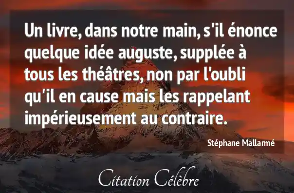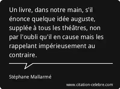 Un livre, dans notre main, s'il énonce quelque idée auguste, supplée à tous les théâtres, non par l'oubli qu'il en cause mais les rappelant impérieusement au contraire.