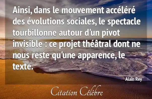 Ainsi, dans le mouvement accéléré des évolutions sociales, le spectacle tourbillonne autour d'un pivot invisible : ce projet théâtral dont ne nous reste qu'une apparence, le texte.