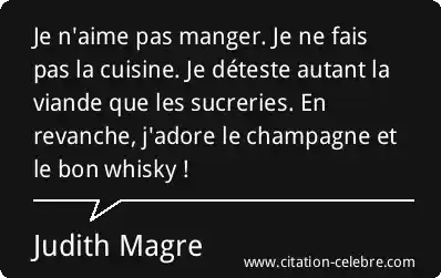 Je n'aime pas manger. Je ne fais pas la cuisine. Je déteste autant la viande que les sucreries. En revanche, j'adore le champagne et le bon whisky !