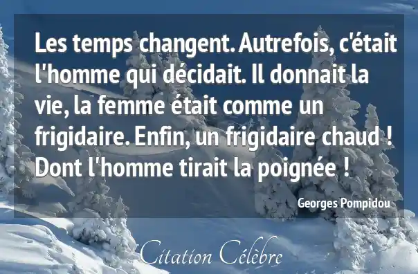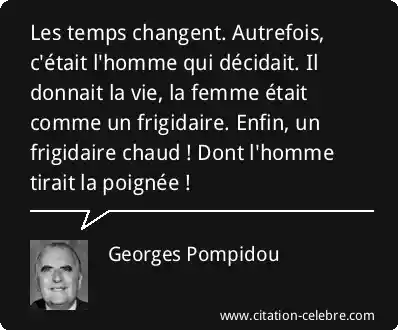 Les temps changent. Autrefois, c'était l'homme qui décidait. Il donnait la vie, la femme était comme un frigidaire. Enfin, un frigidaire chaud ! Dont l'homme tirait la poignée !