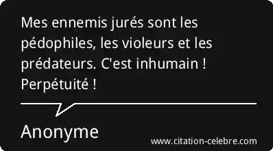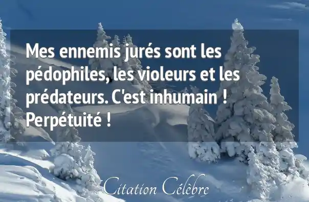 Mes ennemis jurés sont les pédophiles, les violeurs et les prédateurs. C'est inhumain ! Perpétuité !
