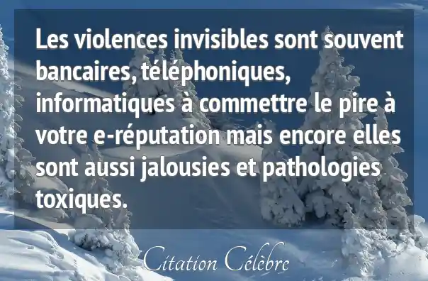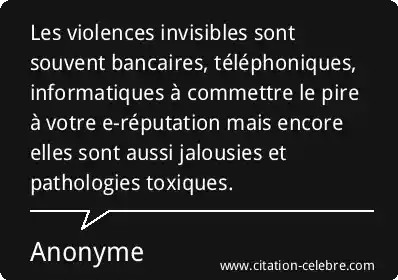 Les violences invisibles sont souvent bancaires, téléphoniques, informatiques à commettre le pire à votre e-réputation mais encore elles sont aussi jalousies et pathologies toxiques.