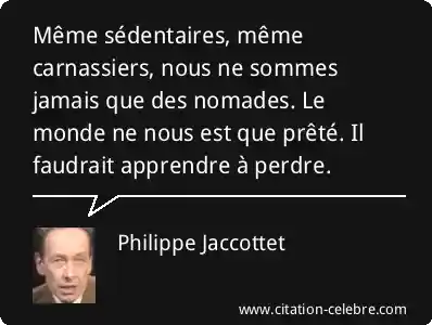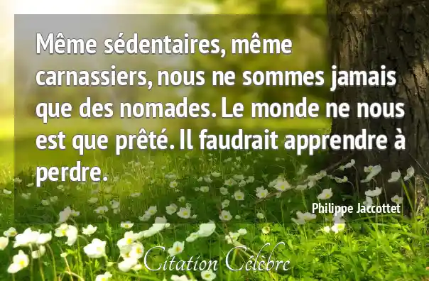Même sédentaires, même carnassiers, nous ne sommes jamais que des nomades. Le monde ne nous est que prêté. Il faudrait apprendre à perdre.