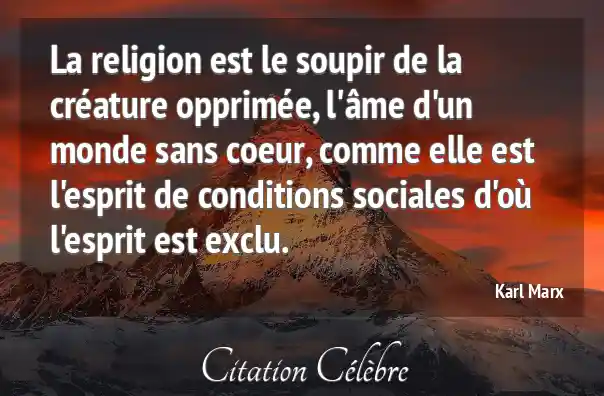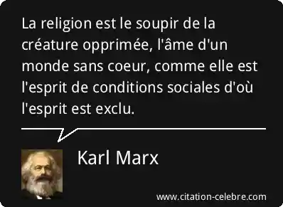 La religion est le soupir de la créature opprimée, l'âme d'un monde sans coeur, comme elle est l'esprit de conditions sociales d'où l'esprit est exclu.