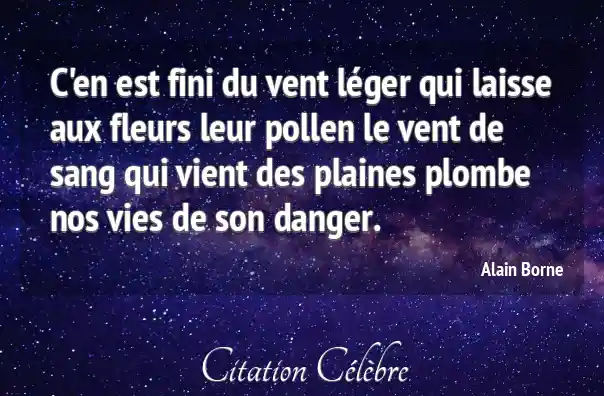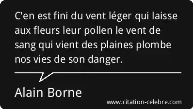 C'en est fini du vent léger qui laisse aux fleurs leur pollen le vent de sang qui vient des plaines plombe nos vies de son danger.