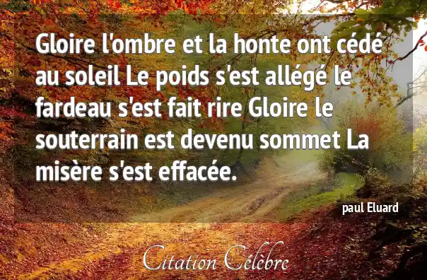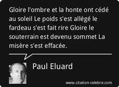 Gloire l'ombre et la honte ont cédé au soleil Le poids s'est allégé le fardeau s'est fait rire Gloire le souterrain est devenu sommet La misère s'est effacée.