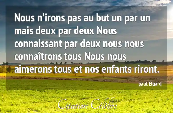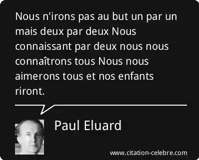 Nous n'irons pas au but un par un mais deux par deux Nous connaissant par deux nous nous connaîtrons tous Nous nous aimerons tous et nos enfants riront.