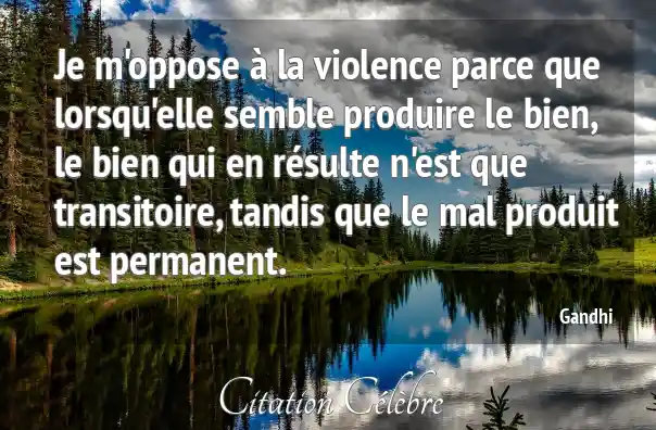 Je m'oppose à la violence parce que lorsqu'elle semble produire le bien, le bien qui en résulte n'est que transitoire, tandis que le mal produit est permanent.