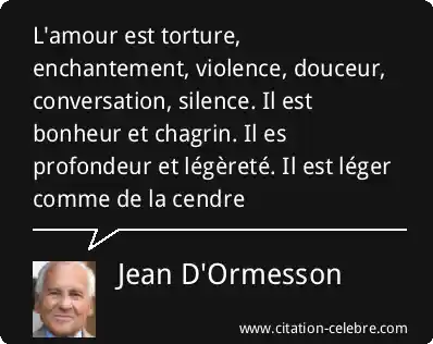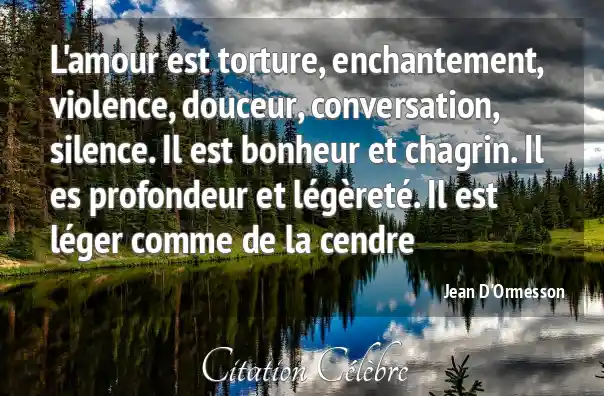L'amour est torture, enchantement, violence, douceur, conversation, silence. Il est bonheur et chagrin. Il es profondeur et légèreté. Il est léger comme de la cendre