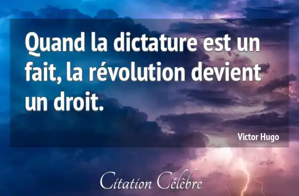 Cette puissante formule de Victor Hugo établit une relation directe et inéluctable entre l'existence d'un régime autoritaire, la dictature, et la légitimité d'une révolte populaire, la révolution. Elle signifie qu'à partir du moment où le pouvoir opprime le peuple et bafoue ses droits fondamentaux – ce qui est la définition d'un fait dictatorial – le peuple acquiert non seulement le droit de se révolter pour retrouver sa liberté, mais aussi l'obligation morale d'y recourir.