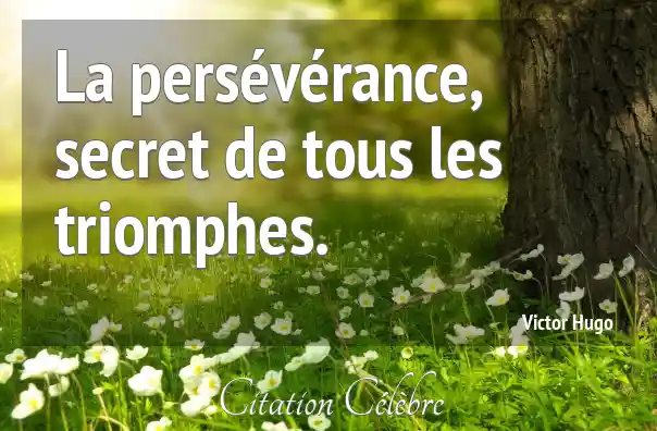 Cette célèbre formule de Victor Hugo, « La persévérance, secret de tous les triomphes », exprime l'idée fondamentale que la réussite dans n'importe quel domaine n'est pas principalement due au talent inné, à la chance ou à la rapidité, mais plutôt à la capacité inébranlable de continuer à agir malgré les obstacles, les échecs ou les difficultés. Le terme « secret » suggère que cette qualité est la clé cachée, l'élément essentiel et souvent sous-estimé qui mène ultimement à la victoire ou à l'accomplissement d'un objectif majeur, désigné par « triomphes ».