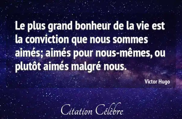Le plus grand bonheur de la vie est la conviction que nous sommes aimés; aimés pour nous-mêmes, ou plutôt aimés malgré nous.
