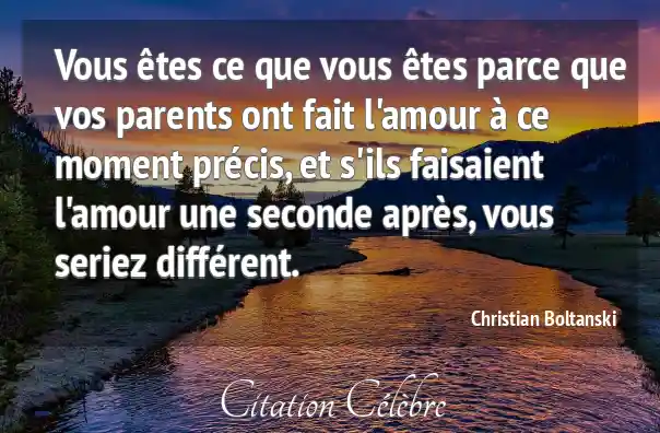 Vous êtes ce que vous êtes parce que vos parents ont fait l'amour à ce moment précis, et s'ils faisaient l'amour une seconde après, vous seriez différent.