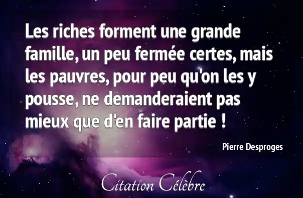 Les riches forment une grande famille, un peu fermée certes, mais les pauvres, pour peu qu'on les y pousse, ne demanderaient pas mieux que d'en faire partie !