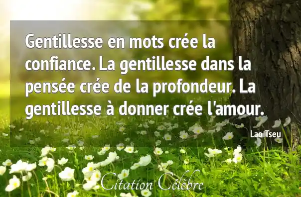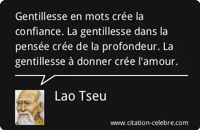 Gentillesse en mots crée la confiance. La gentillesse dans la pensée crée de la profondeur. La gentillesse à donner crée l'amour.
