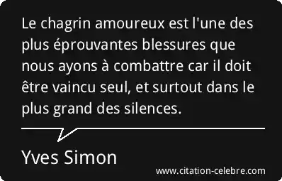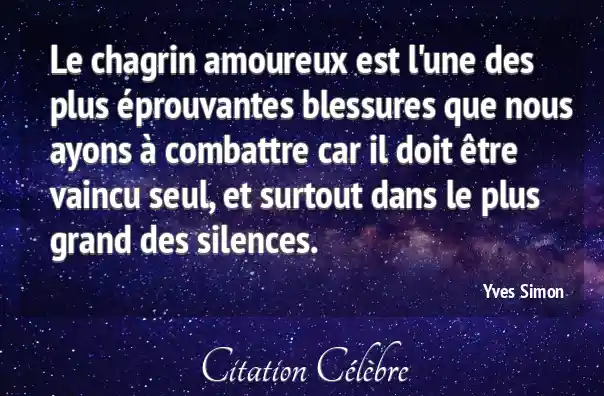 Le chagrin amoureux est l'une des plus éprouvantes blessures que nous ayons à combattre car il doit être vaincu seul, et surtout dans le plus grand des silences.