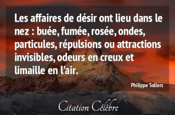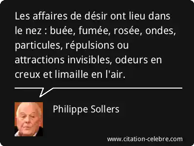 Les affaires de désir ont lieu dans le nez : buée, fumée, rosée, ondes, particules, répulsions ou attractions invisibles, odeurs en creux et limaille en l'air.