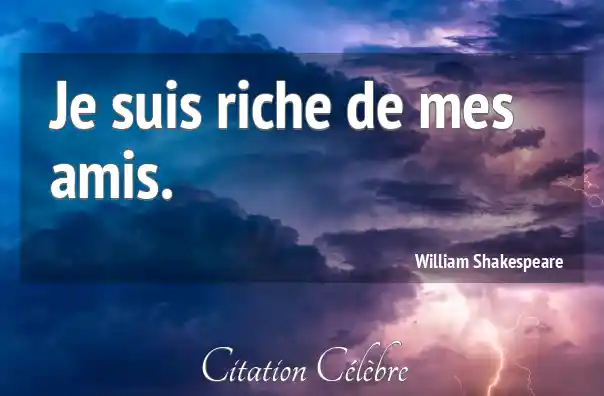 Cette célèbre formule de William Shakespeare exprime l'idée que la véritable richesse d'une personne ne réside pas dans ses biens matériels ou sa fortune financière, mais dans la qualité et le nombre de ses amitiés. Être "riche de ses amis" signifie que les relations humaines sincères, le soutien et l'affection des proches ont une valeur inestimable, bien supérieure à l'or ou à l'argent. C'est une affirmation de la primauté des liens sociaux sur la richesse matérielle.