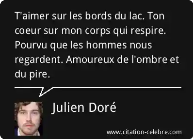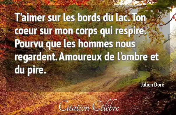 T'aimer sur les bords du lac. Ton coeur sur mon corps qui respire. Pourvu que les hommes nous regardent. Amoureux de l'ombre et du pire.