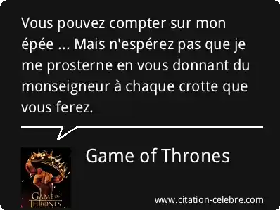 Vous pouvez compter sur mon épée ... Mais n'espérez pas que je me prosterne en vous donnant du monseigneur à chaque crotte que vous ferez.