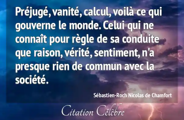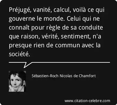 Préjugé, vanité, calcul, voilà ce qui gouverne le monde. Celui qui ne connaît pour règle de sa conduite que raison, vérité, sentiment, n'a presque rien de commun avec la société.