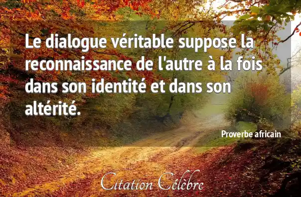 Ce proverbe énonce que pour qu'un dialogue soit considéré comme "véritable" ou authentique, il est nécessaire d'accepter la personne en face de vous sous deux aspects fondamentaux. Premièrement, dans son identité, ce qui se réfère à ce qui la définit : sa personnalité, ses valeurs, son histoire, ses croyances propres. Deuxièmement, dans son altérité, c'est-à -dire sa qualité d'être "autre", différent de vous, avec ses spécificités uniques.