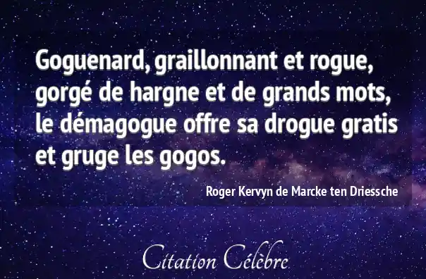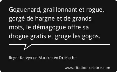 Goguenard, graillonnant et rogue, gorgé de hargne et de grands mots, le démagogue offre sa drogue gratis et gruge les gogos.