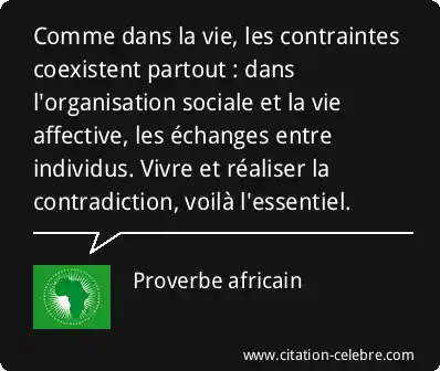 Comme dans la vie, les contraintes coexistent partout : dans l'organisation sociale et la vie affective, les échanges entre individus. Vivre et réaliser la contradiction, voilà l'essentiel.