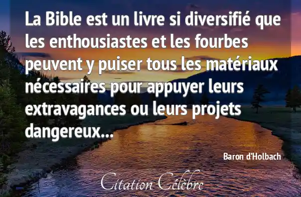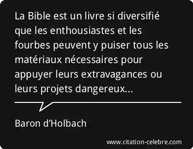 La Bible est un livre si diversifié que les enthousiastes et les fourbes peuvent y puiser tous les matériaux nécessaires pour appuyer leurs extravagances ou leurs projets dangereux...