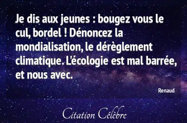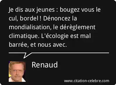 Je dis aux jeunes : bougez vous le cul, bordel ! Dénoncez la mondialisation, le dérèglement climatique. L'écologie est mal barrée, et nous avec.
