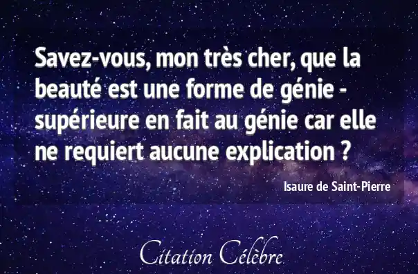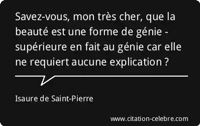 Savez-vous, mon très cher, que la beauté est une forme de génie - supérieure en fait au génie car elle ne requiert aucune explication ?