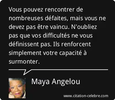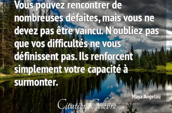 Vous pouvez rencontrer de nombreuses défaites, mais vous ne devez pas être vaincu. N'oubliez pas que vos difficultés ne vous définissent pas. Ils renforcent simplement votre capacité à surmonter.