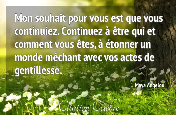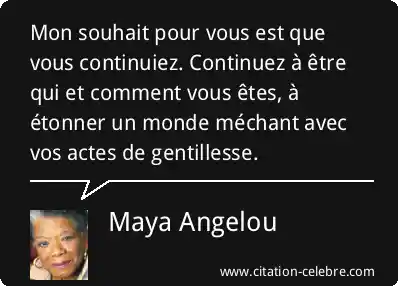 Mon souhait pour vous est que vous continuiez. Continuez à être qui et comment vous êtes, à étonner un monde méchant avec vos actes de gentillesse.