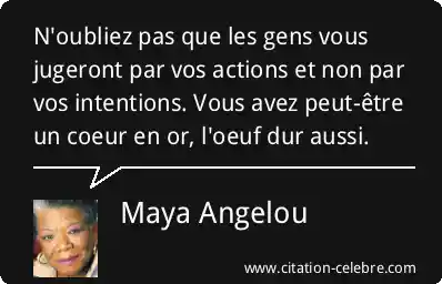 N'oubliez pas que les gens vous jugeront par vos actions et non par vos intentions. Vous avez peut-être un coeur en or, l'oeuf dur aussi.