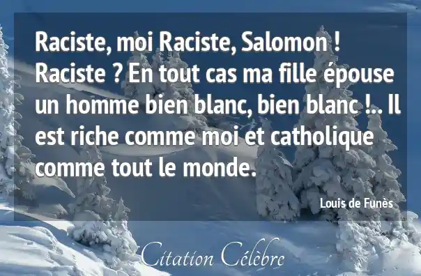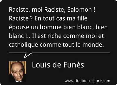 Raciste, moi Raciste, Salomon ! Raciste ? En tout cas ma fille épouse un homme bien blanc, bien blanc !.. Il est riche comme moi et catholique comme tout le monde.