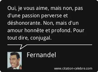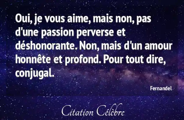 Oui, je vous aime, mais non, pas d'une passion perverse et déshonorante. Non, mais d'un amour honnête et profond. Pour tout dire, conjugal.