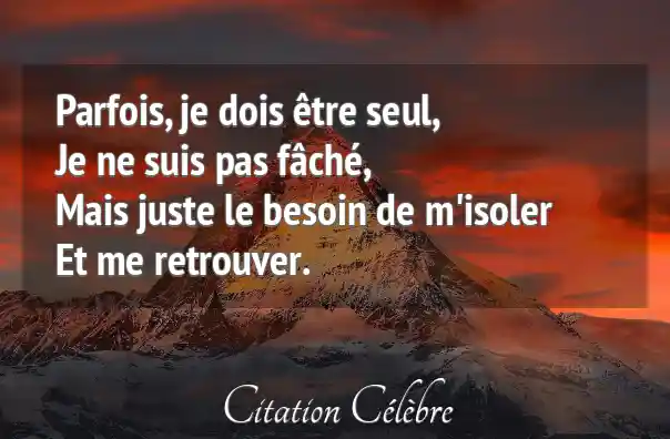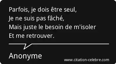 Cette citation exprime un besoin profond et légitime de solitude choisie, non pas comme une réaction négative (la colère ou la frustration), mais comme une nécessité pour l'équilibre intérieur. L'auteur précise qu'il n'est pas "fâché", soulignant que cette prise de distance n'est pas dirigée contre autrui, mais est un acte d'introspection et de ressourcement personnel. Le but est de se "retrouver", c'est-à -dire de revenir à son essence, de faire le point, et de se reconnecter à ses propres pensées et sentiments.