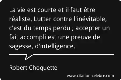 La vie est courte et il faut être réaliste. Lutter contre l'inévitable, c'est du temps perdu ; accepter un fait accompli est une preuve de sagesse, d'intelligence.